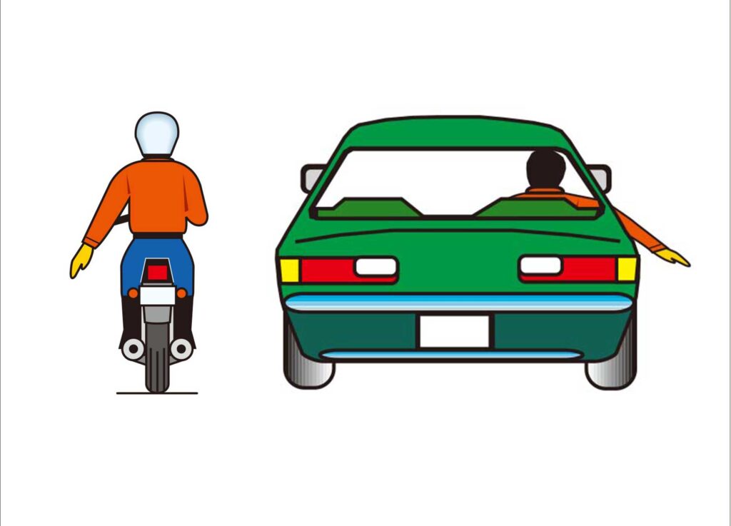 車両の運転者は左折、右折、転回、徐行、停止、後退のほか、同一方向に進行しながら進路を変えるときは、手、方向指示器または灯火により定められた時期や方法により合図を出し、その行為が終わるまで合図を継続する。